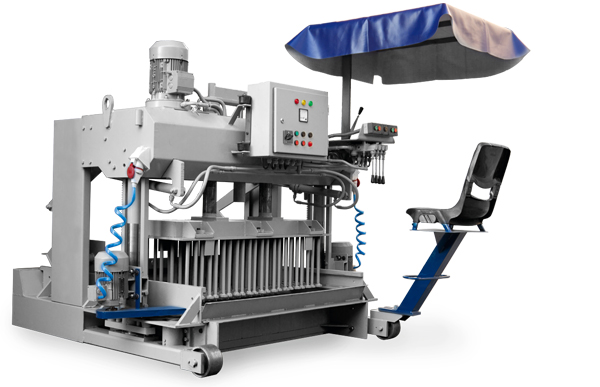 Semiautomatic machine equipped with a bucket to feed the mould and moving on 4 ball bearing with plastic blade that clean the mould while it moves